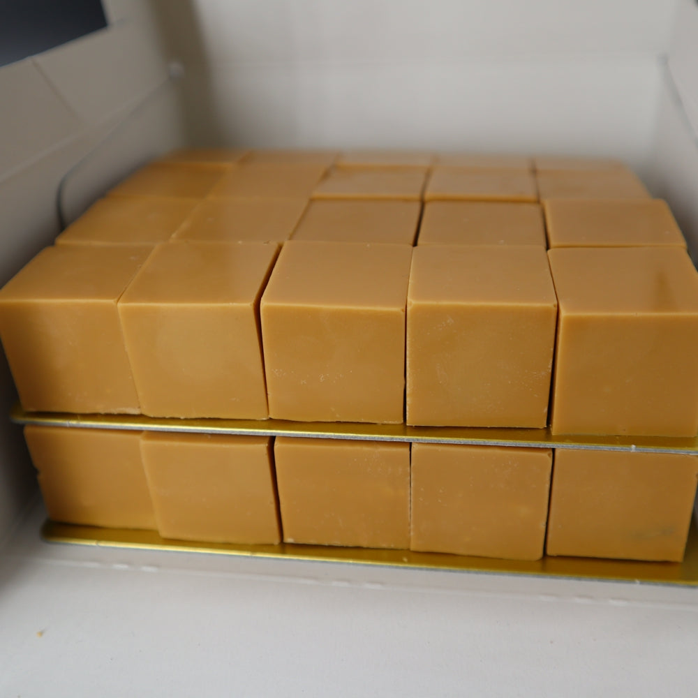 香ばしくてクリーミーに仕上げたキャラメルチョコレートをたっぷり使って、一粒ずつ手作りでキューブ型に仕上げました。